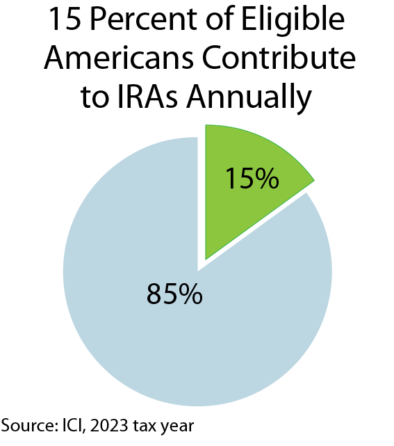 The third pillar—personal savings—refers to what individuals save beyond any savings they may have through a workplace plan. Americans are living longer, yet few are saving for retirement on their own. According to the Investment Company Institute (ICI), in 2023 only 15% of eligible taxpayers across all US households contributed to either traditional or Roth individual retirement accounts (IRAs).